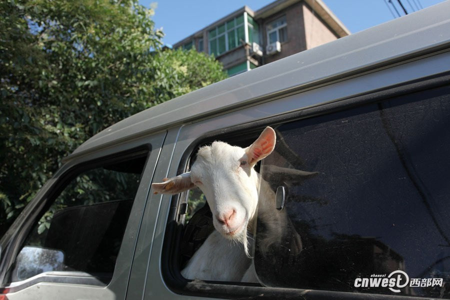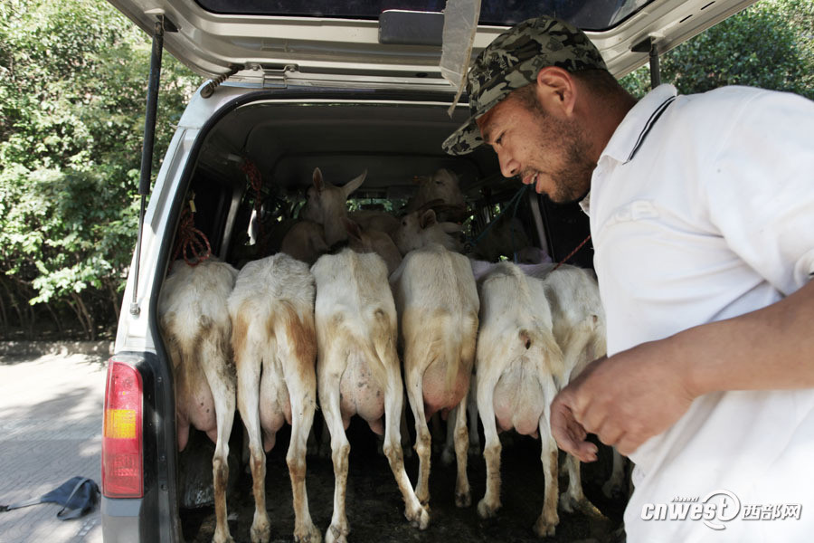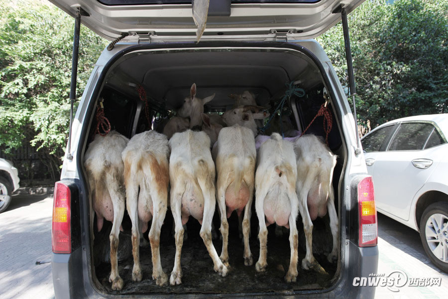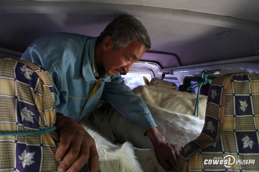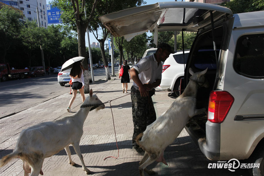 6月16日上午快到9点了,西安经九路,黄浩英和妻子及雇工刘师傅将赶完早市的10只奶羊牵上面包车返回。“得赶紧回家,10只羊和3个人挤在一辆面包车里太热了。” 黄浩英边说边发动汽车。图为黄浩英将赶完早市的10只奶羊牵上面包车准备返回。