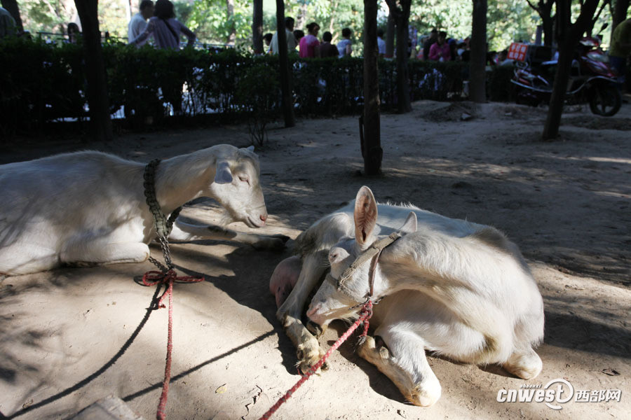 养羊很苦,拉着羊进城卖奶,给羊们煮苞谷碜稀饭,放羊,清理羊圈,黄浩英几乎每天都要从凌晨4点忙到夜里10点,就是睡也只能睡在羊圈旁临时搭起的简易房里。图为羊们起的早也困,在早市上睡着了。