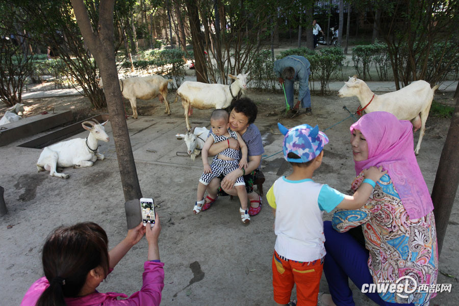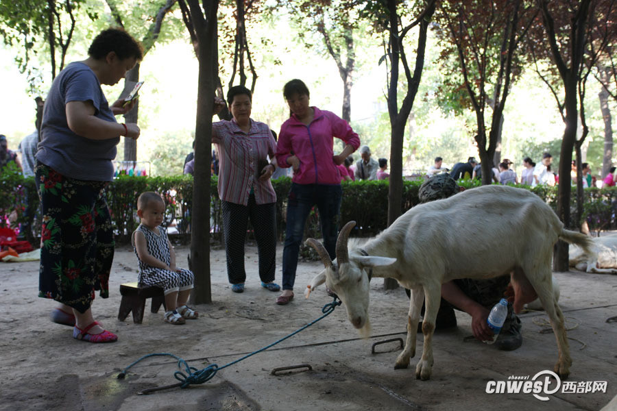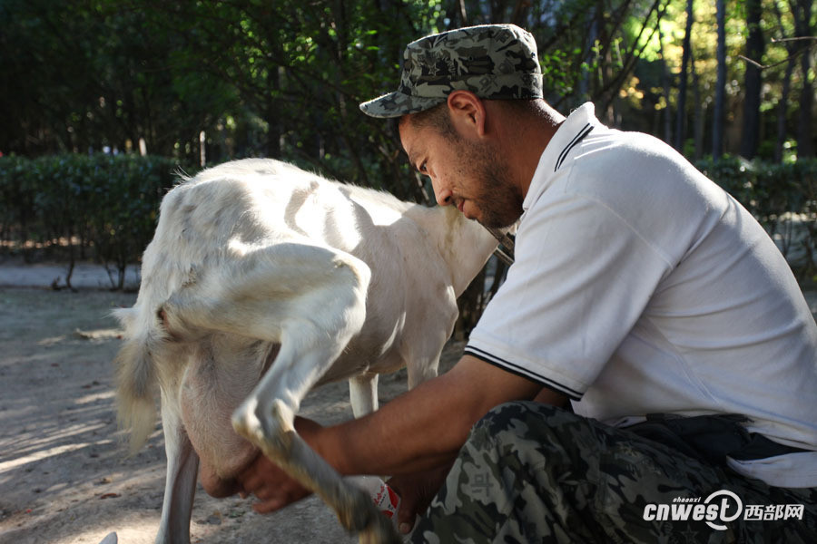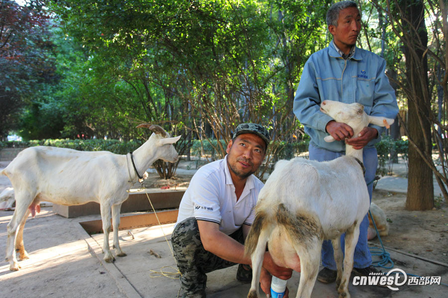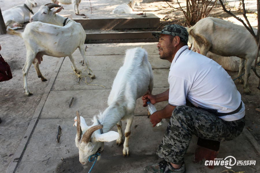 47岁的黄浩英是西安市雁塔区千户村人,他们村早就没有土地,村民们靠出租房子过着悠闲自在的生活,3年前当黄浩英在长安区赵家湾村租地养羊时,村里人都笑话黄浩英放着清闲日子不过,去荒郊野地找罪受。图为黄浩英现挤现卖羊奶。