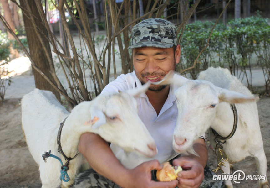 图为刘师傅和羊挤在一起。