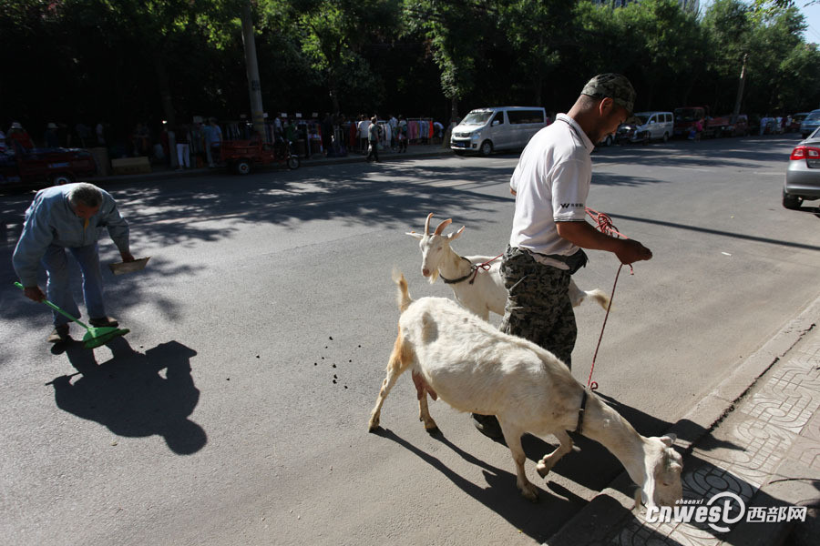 黄浩英牵着羊过马路,他的雇工刘师傅跟在后面清扫羊屎。