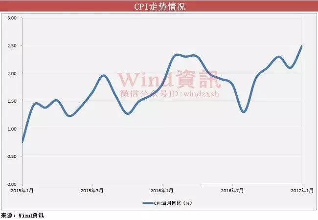 而作为工业品的原材料价格还在上涨。以天然橡胶为例,截至2月14日,上海期货交易所的橡胶价格为21890元/吨,与2月初相比上涨了7.14%;与2016年初相比,天然橡胶的涨幅更是高达120%以上。 CPI绝对值还不算高,但已经开始上扬。据国家统计局近日发布的数据显示,2017年1月份,中国居民消费价格(CPI)同比上涨2.5%,涨幅创下三年来新高。