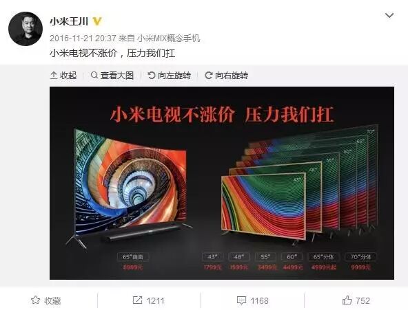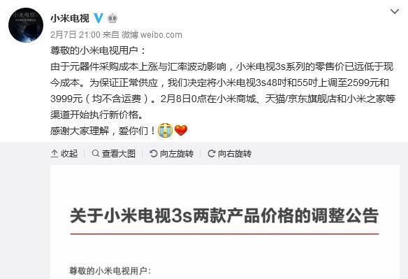 微博才发出短短1个多月,小米就扛不住了。 2月7日,小米电视官方微博发布信息称,由于元器件采购成本上涨与汇率波动影响,小米两款电视的价格均将上调。