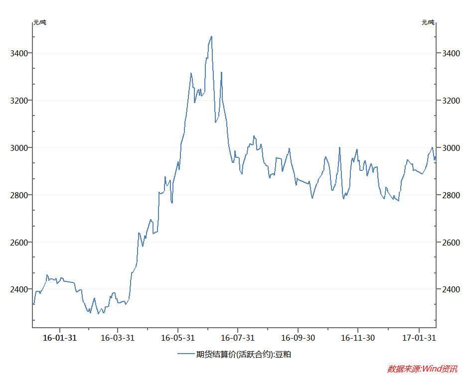 豆粕去年年初至今涨价幅度达到25%,不过在去年年中到达顶峰后便一路下滑,不过在去年年底开始,有缓慢爬坡势头,从去年12月开始至今,涨幅达到8%。
