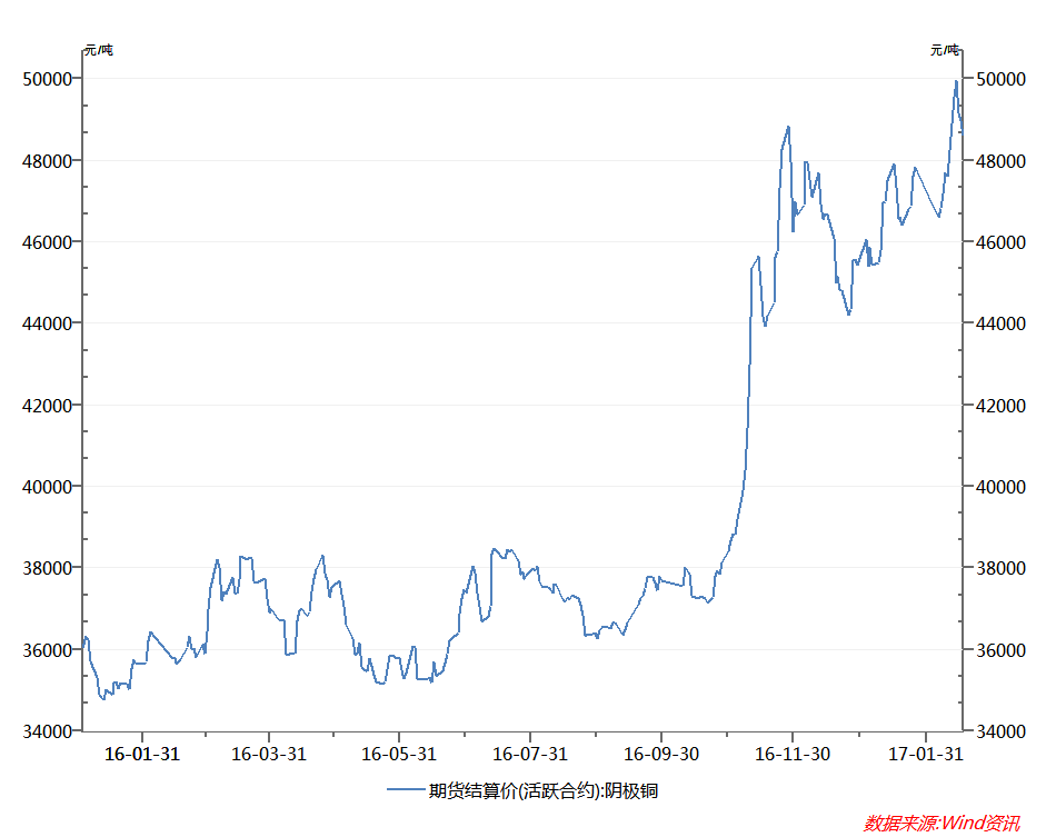 业内指出,这轮上涨主要自于铁矿石结构性需求,特别是对高品位铁矿石的需求。去年9月以来,高低品位铁矿石间价差不断拉大。同时,高品位铁矿石供应出现相对紧缺。 现在62%品位铁矿石价格达81.62美元/吨,而65%品位的铁矿石更是高达94.75美元/吨,价格相差13.13美元/吨,也就是1个品位4.38美元,乘以6.9人民币兑美元汇率就是30块钱左右。 实际上,说到去年以来的大宗商品上涨,只能用“没有最高,只有更高”来形容。从下面几张图可以看到,从去年年底开始的一波涨幅很明显。 铜,在过去的一年,从36050元/吨左右,暴涨到48600元/吨,涨幅近35%;而从去年12月开始算起,在这2个月多的时间内,涨幅也达到3.4%。