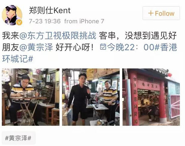 郑则仕还特意在微博上发了消息,说自己来《极限挑战》客串,还和好朋友黄宗泽互动了。