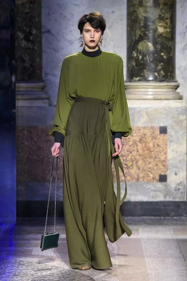 " \; a& P0 i$ L% ?2018 Fall/Winter Milan Fashion Week Runway Anteprima 马丁尼橄榄绿,介于绿色和棕色之间,当中最赋有沉稳的颜色。