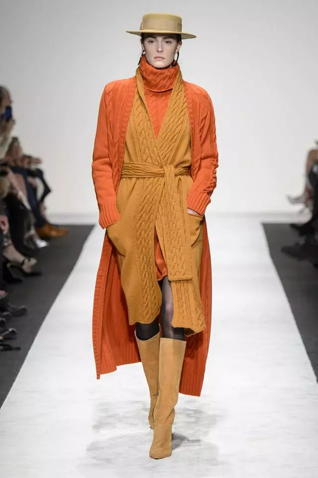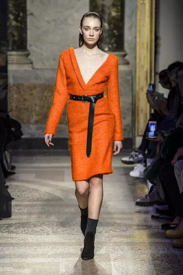 ( p7 K8 M" s. G+ i# N. S+ P, y2018 Fall/Winter Milan Fashion Week Runway Vladimiro Gioia 大地色系的枯叶橘,饱满而温暖,散发着一股富裕的气息,是最受欢迎的秋冬色系。