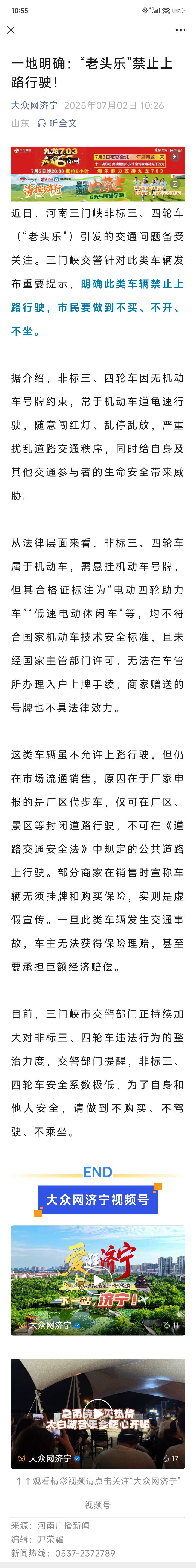 [济宁资讯] 一地明确:“老头乐”禁止上路行驶!