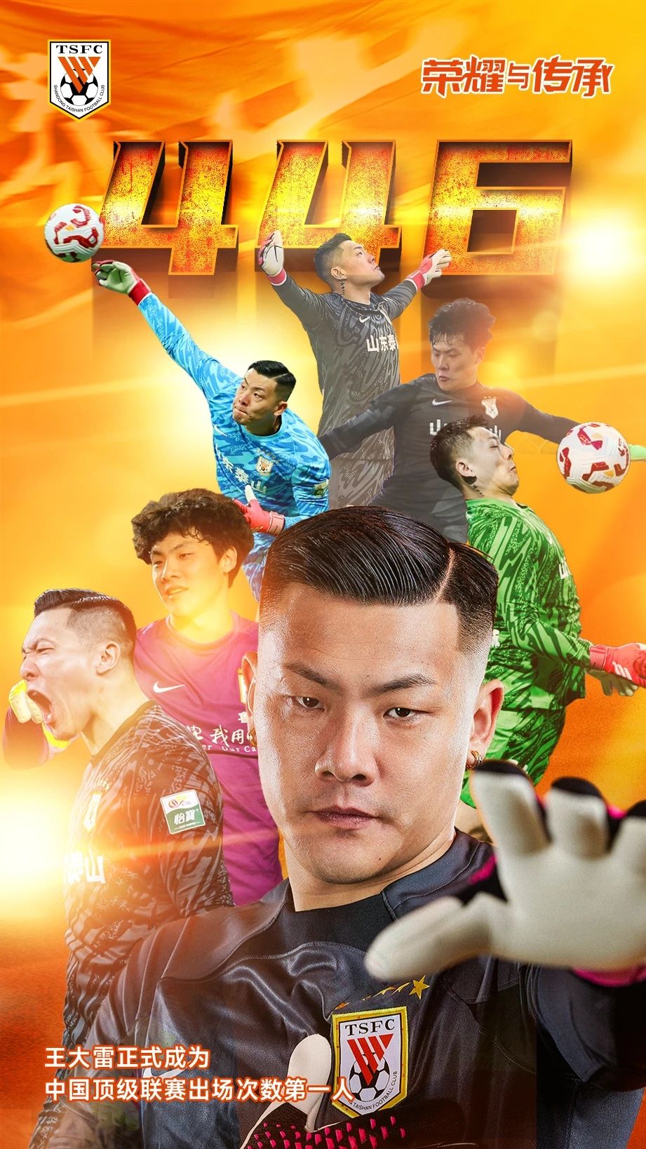 [济宁资讯] 山东泰山王大雷以职业生涯446次的出场次数位列第一! |