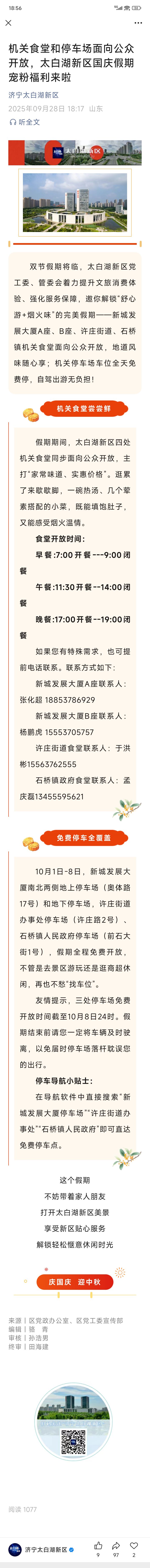 [济宁资讯] 机关食堂和停车场面向公众开放,太白湖新区国庆假期宠粉福利来啦 |